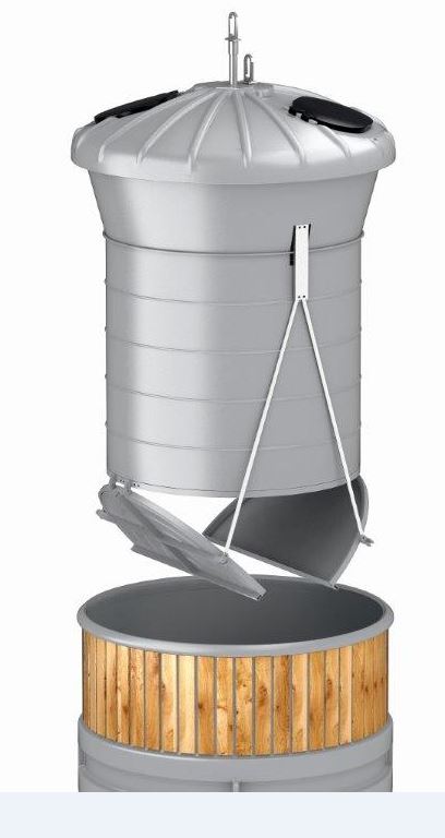 Vasta scelta di campane per rifiuti, di capienza e colori diversi. Per il sollevamento e lo svuotamento, tutte le campane possono essere fornite di un apposito doppio gancio, gancio automatico KINSHOFER o gancio NORD ENGINEERING.