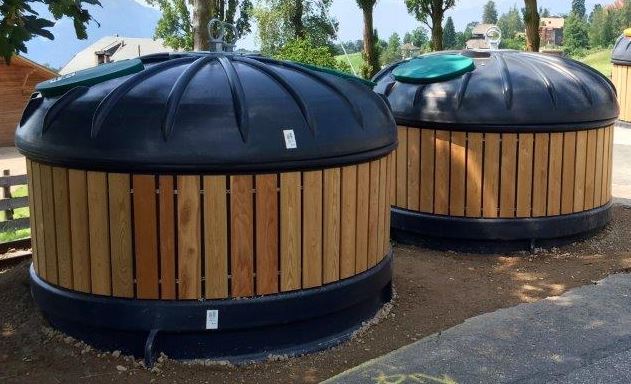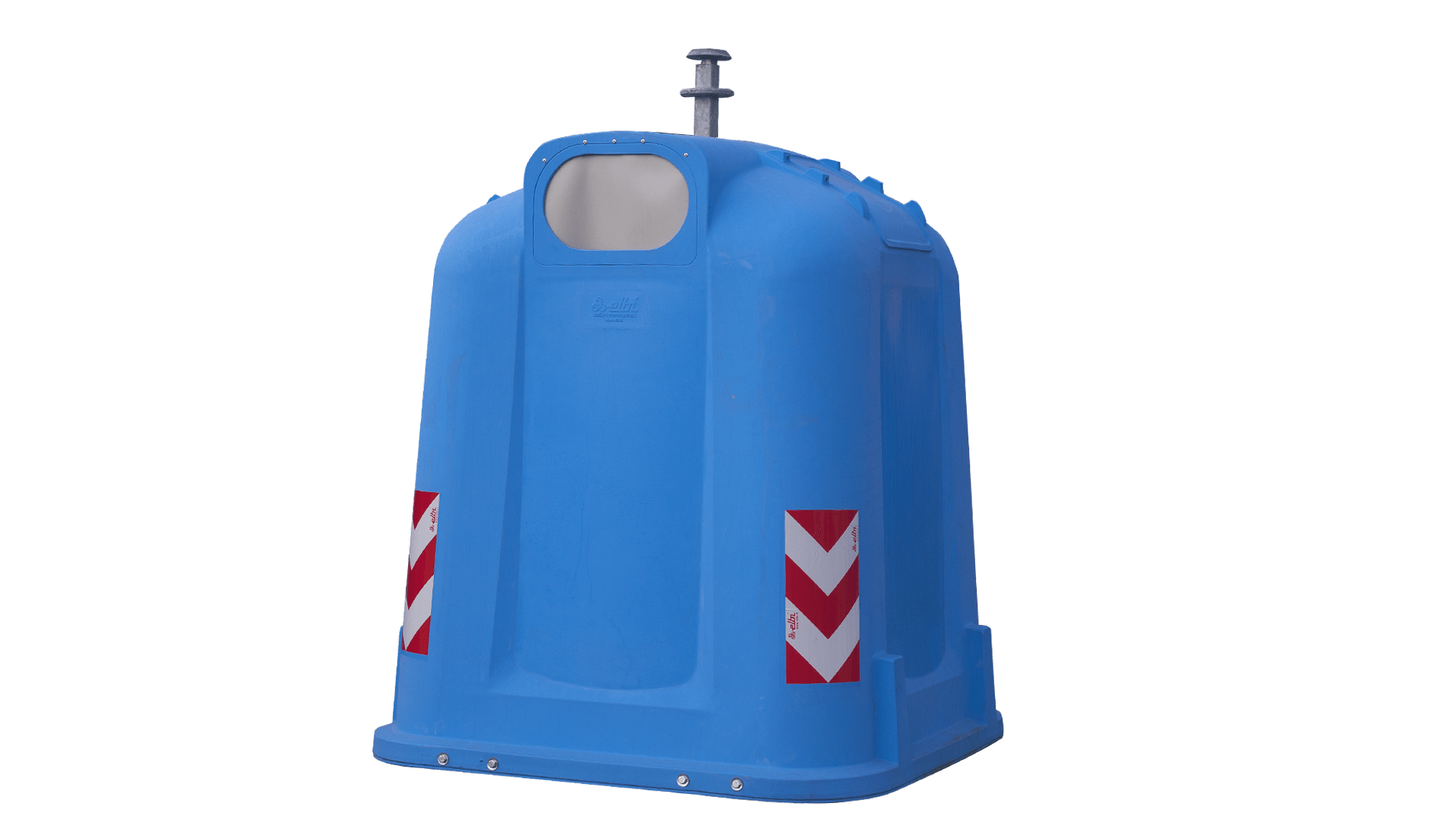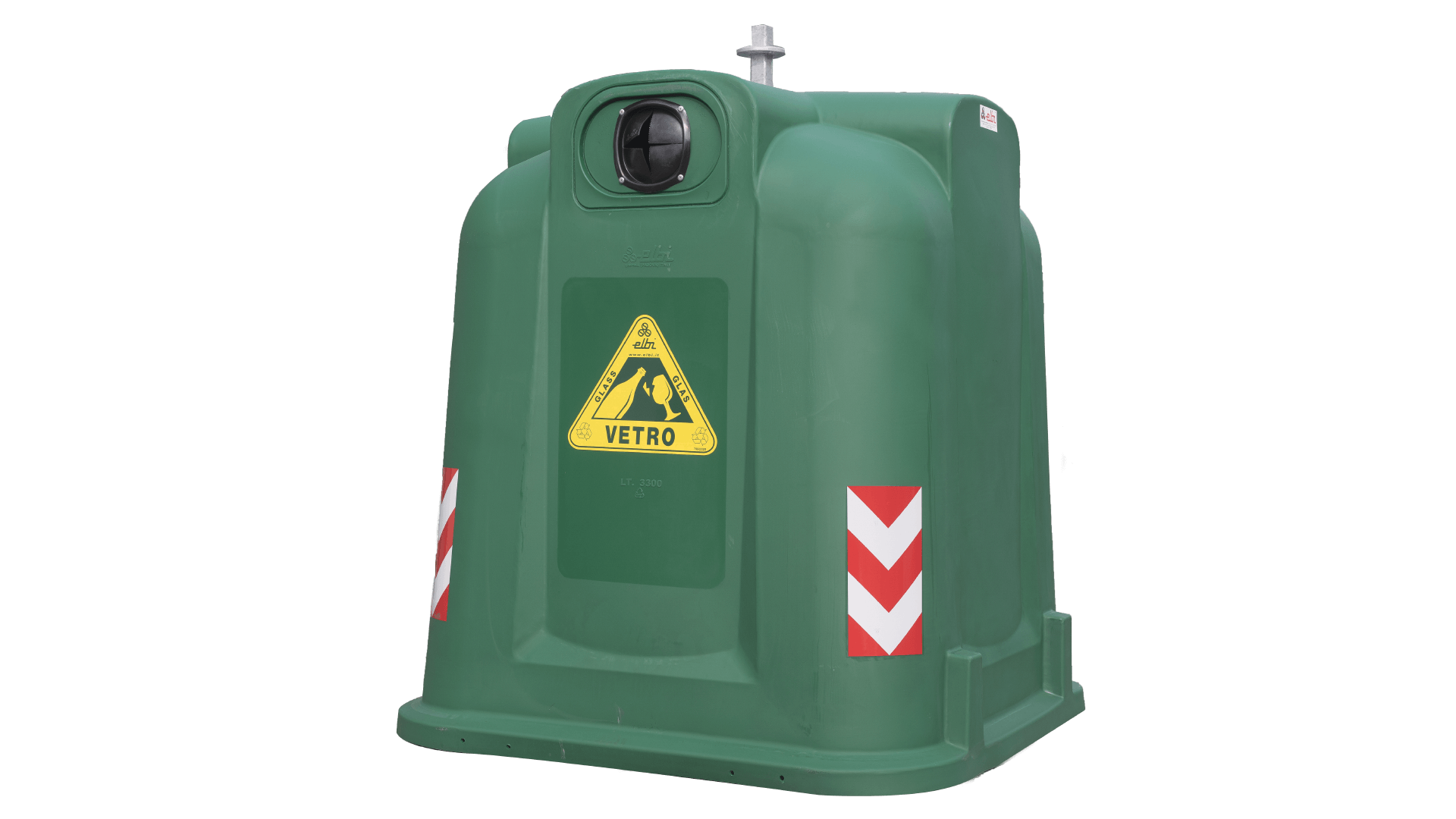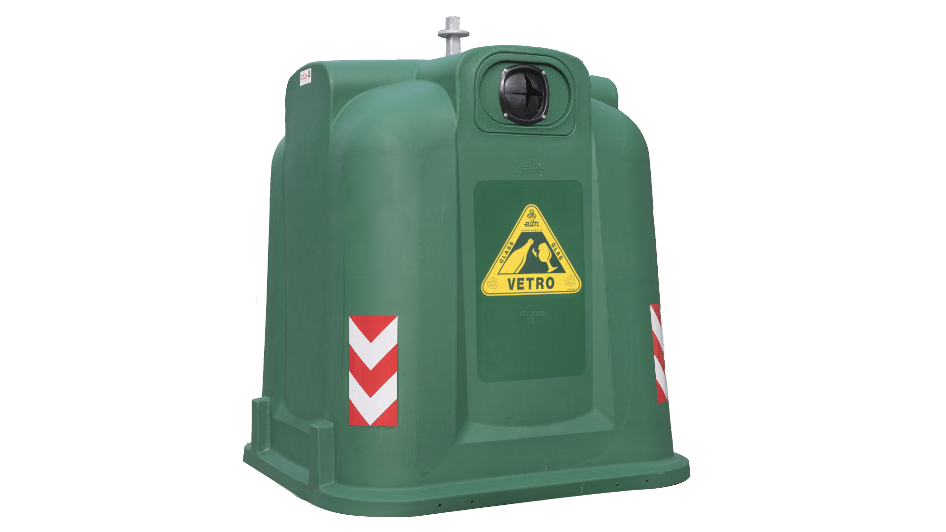 Vasta scelta di campane per rifiuti, di capienza e colori diversi. Per il sollevamento e lo svuotamento, tutte le campane possono essere fornite di un apposito doppio gancio, gancio automatico KINSHOFER o gancio NORD ENGINEERING.